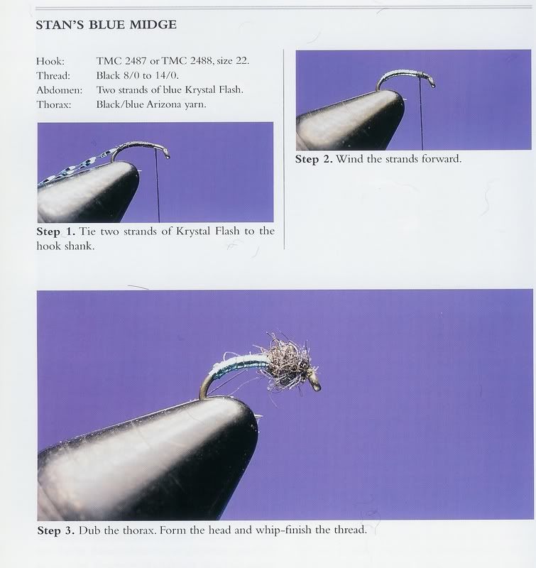 Blue chironomid patterns can also be effective on freestone streams and tailwaters. On the South Platte (tailwater) in Colorado, Stan Benton's Blue Midge works well some days, often when nothing else will. The pattern is featured in Ed Engle's Tying Small Flies. The dubbing prescribed is chopped & blended Arizona Sparkle Yarn (Black/Blue). Arizona (John Rohmer) may have discontinued the Sparkle Yarn, however. Their Diamond Braid may work as well) The body can be any metallic tinsel, or even wire (UTC carries their Ultra Wire now in a Blue, x-small and up).