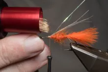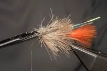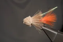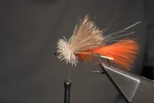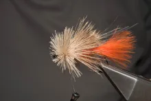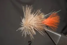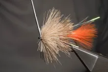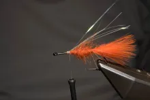 This version has a natural deer hair head, a bit of flash as a wing and an orange tail made from marabou.
