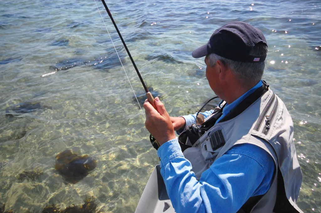 Henning fighting a smallish fish in the very clear spring water.