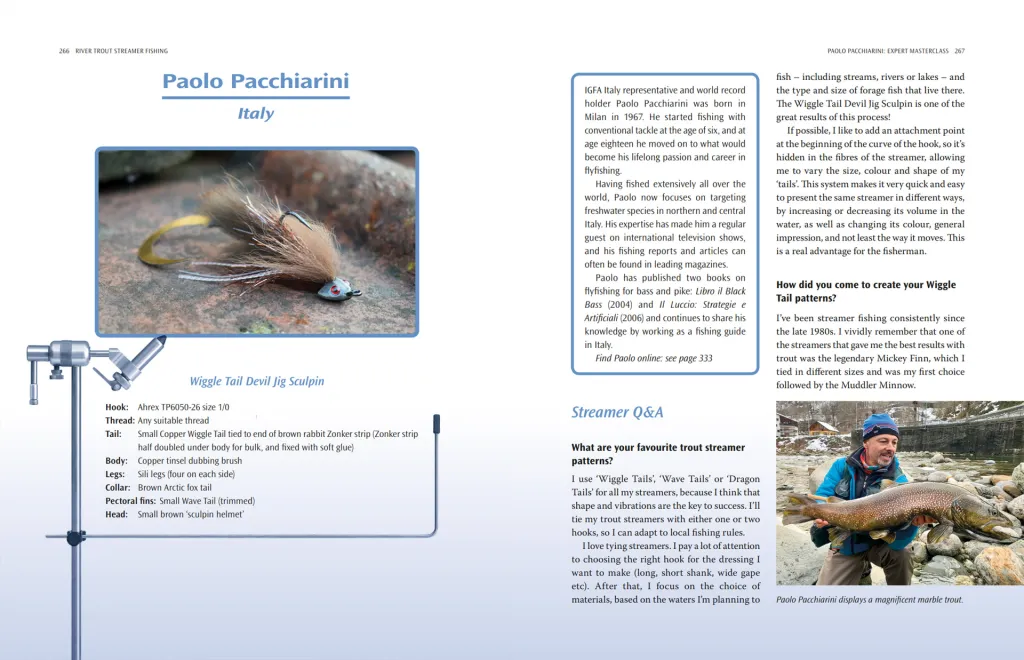 Paolo Pacchiarini masterclass opening spread is an example of the way the many tyers are presented in "River Trout Streamer Fishing"
