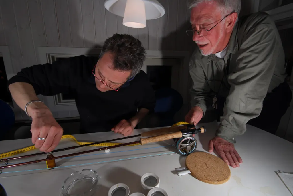 Jens and Jørgen marking rods with measures for fish length.