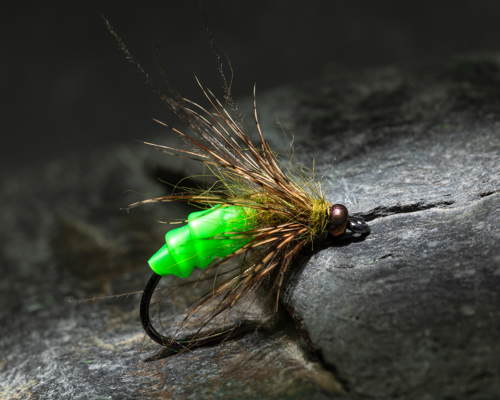 Having use the bead tube to tie two stages of pupa development it occurred to me that maybe I could go back a life stage and tie and tie a cased caddis larvae. The green tube would obviously imitate the larval body, but how to give it a dark head?