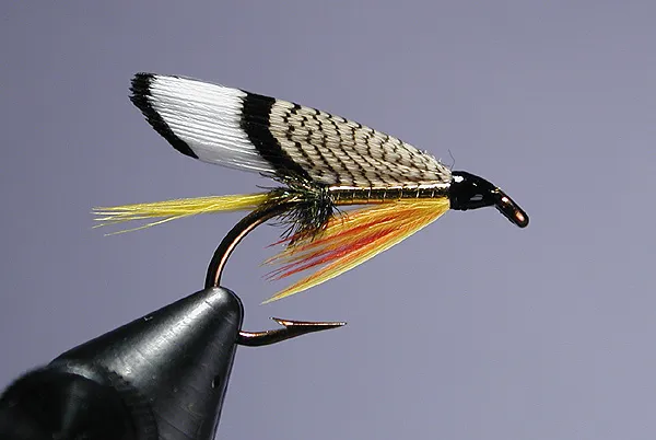 A real pretty fly. Nice combination of colors and materials. The wing can be made with either matching left/right slips of barred woodduck, or taking one wider slip and folding it lengthwise (the British method).