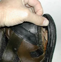 - internal structures breaking: heel cups, steel inserts in soles etc.