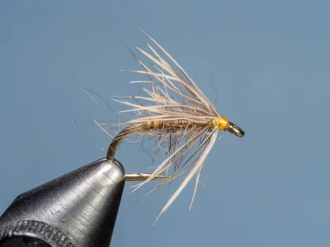 | Body | Yellow (or Primrose) Pearsall’s Gossamer (I think this is Ephemera #2400 thread) and Loosely dubbed hare’s ear dubbing, allowing some of the thread to show |
