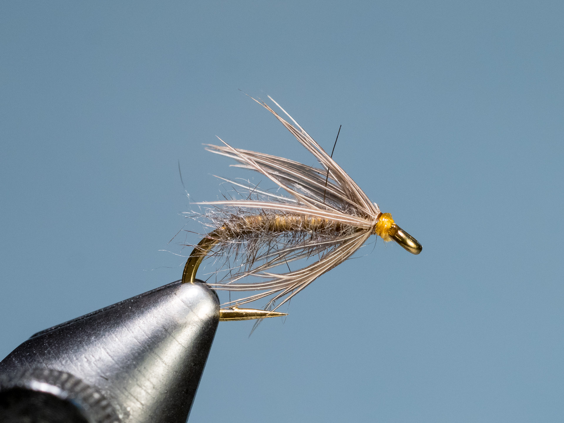 | Body | Yellow (or Primrose) Pearsall’s Gossamer (I think this is Ephemera #2400 thread) and natural mole, touch dubbed, to allow some thread to show |