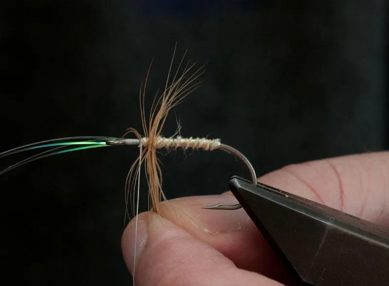 Turn the hackle in a few (2-3) close turns right in front of the rear body