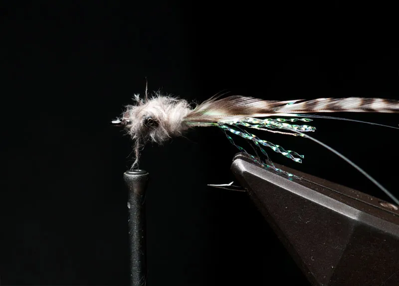 Wrap the dubbed thread forwards over the head, criss-cross between the eyes and a couple of wraps in front of the eyes
