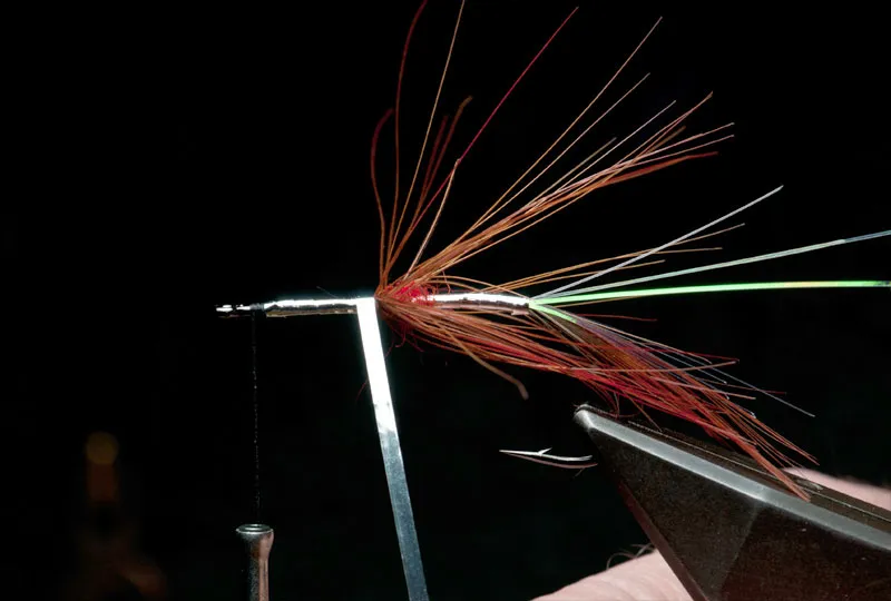 Tie in the tinsel in front, leaving space for a hackle and a head