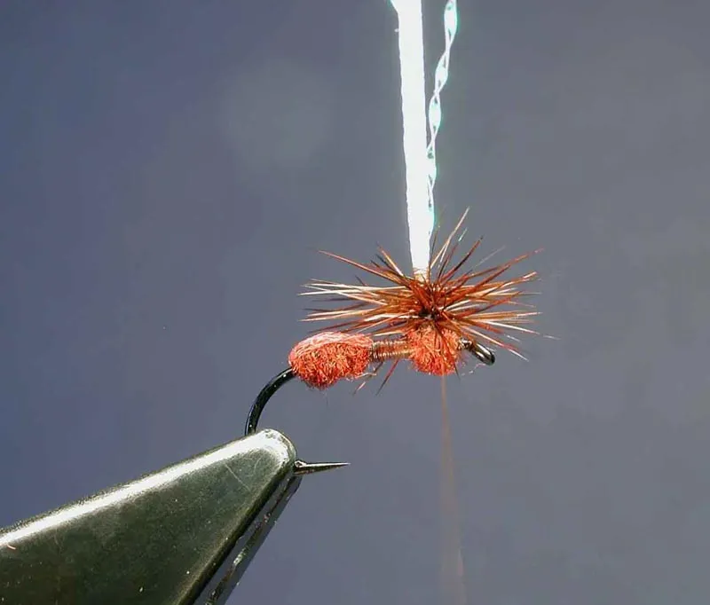 Hackle the parachute down to the thorax/head. Because you're hackling around a small diameter post you may want to make 5 to 7 wraps. Or less, if you want the ant to sink (more on that later).
