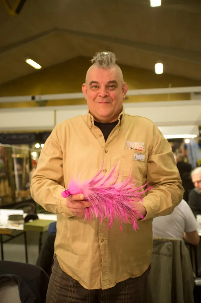 Dutch Herman Broers ties large flies - like a foot long - often stacking feathers as a feather duster