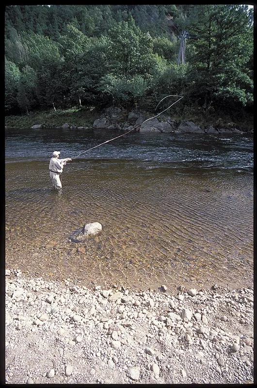 This is a classical salmon lie: deeper water cuts under the opposite bank leaving some calm water for the fisher to stand in. A few large boulders create turbulence and shelter down there. The fish will be moving right outside the seam between the fast and the slow water. We saw many fish here, but felt nothing.