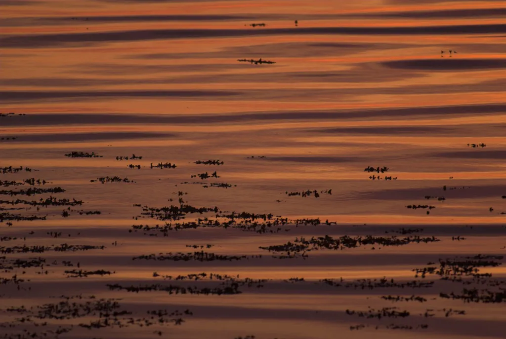 An almost abstract pattern painted on the surface of the oily smooth water by the setting sun.