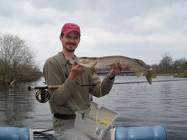 The author - Mark Dysinger - with a pike, which readily take flies like the Prince of Pike or the Poxy Bunny.