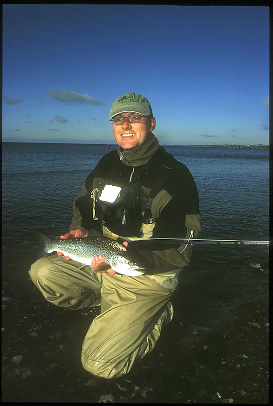 It might look warm and sunny, but trust me... it's not! The cold weather Monic line has done its job well in spite of the low air and water temperatures and landed me this nice 2 kilo or 4 lbs. sea run brown trout.