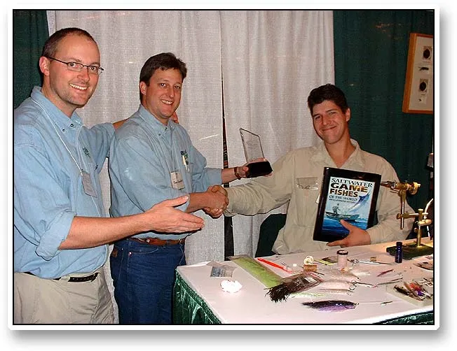 Chris French (right) won the grand prize in the salt water baitfish category of the FlyMeister 2001 fly tying contest.
