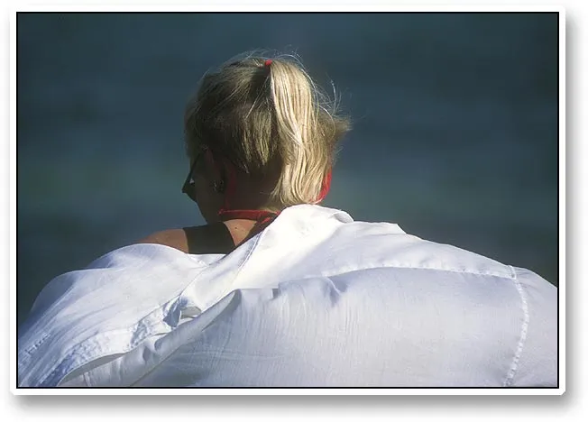 My girlfriend Birgitte in the intense sun. A couple of used men's shirts made a fine sunscreen.