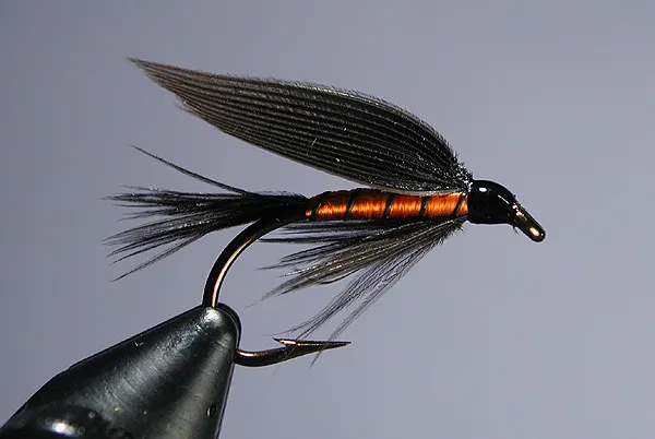 This was supposed to be a Lord Baltimore, until I realized I forgot the jungle cock eye. As luck would have it, there was also a fly named the Black and Orange that match this recipe perfectly. Lucky me. Since my dyed black goose was more of a dark blue, I used natural crow quill for the wing. Looks nice.