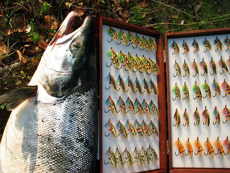This salmon from Norwegian river Tana took a full dressed, classical Black Doctor, but could have had its choice from the impressing box opened next to the fish right after the catch.