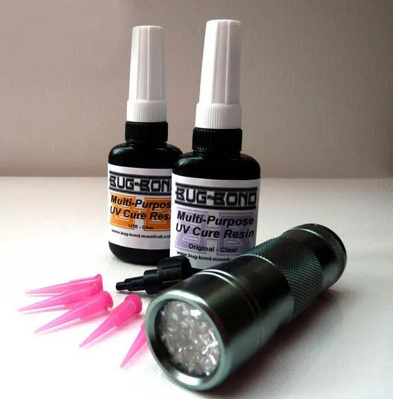 Bug-Bond comes in a thin and a thick version in small bottles, which can be equipped with very fine nozzles. In the foreground you see the small curing lamp.