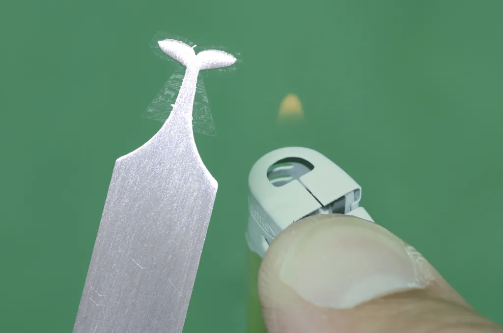 Once the wing material has been trimmed with scissors, you burn and melt the surplus away, leaving a niceely shaped wing under the protective metal wing burner