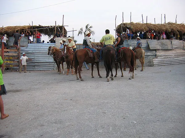 The cowboys waiting to be let into the arena to catch the bull after the toreodores have done their job.