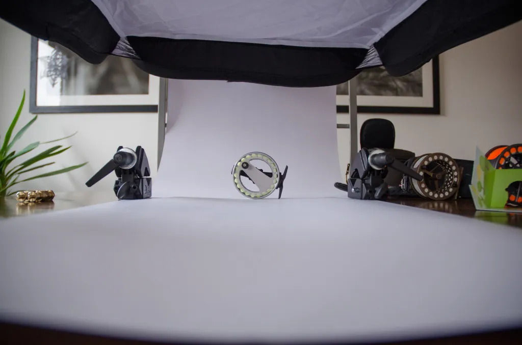 Seen from the camera's viewpoint. The lightbox above, the subject and the background