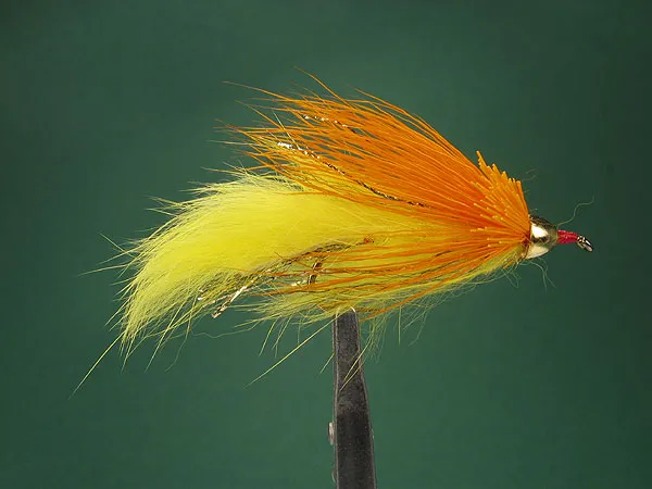 Yellow/orange "Candy Corn" Zuddler with gold HT braid body and gold cone head.