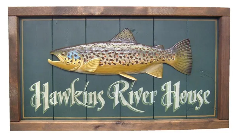 A carved and painted brown trout