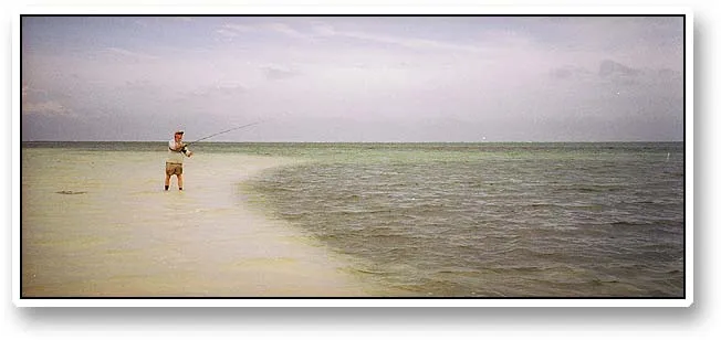 Martin casting from the shallows over a deeper part in pursuit of barracuda. These fearfully fast predators will appear from nowhere and tear a fly up like nothing else.