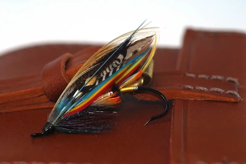 A classic salmon fly on a classic leather box for a classic reel, all set in classic soft light inside a large plastic box