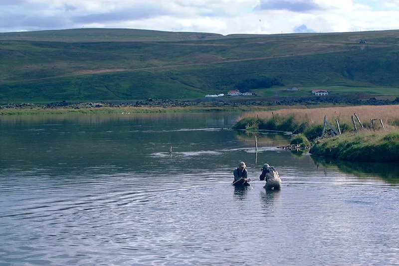 Martin snaps a picture of Asger and a fish with the grand backdrop of the the Laxá.