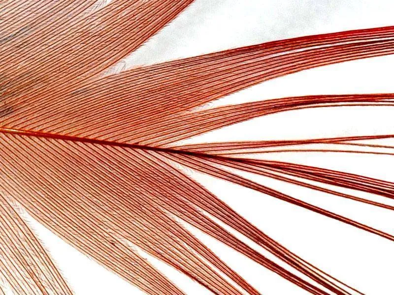A close-up of a golden pheasant flank feather shows the loose structure of the barbs, which will marry very loosely and because of that create great hackles