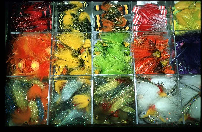 The selection of flies is enormous as this colorful box in one booth shows. The variations seem endless.