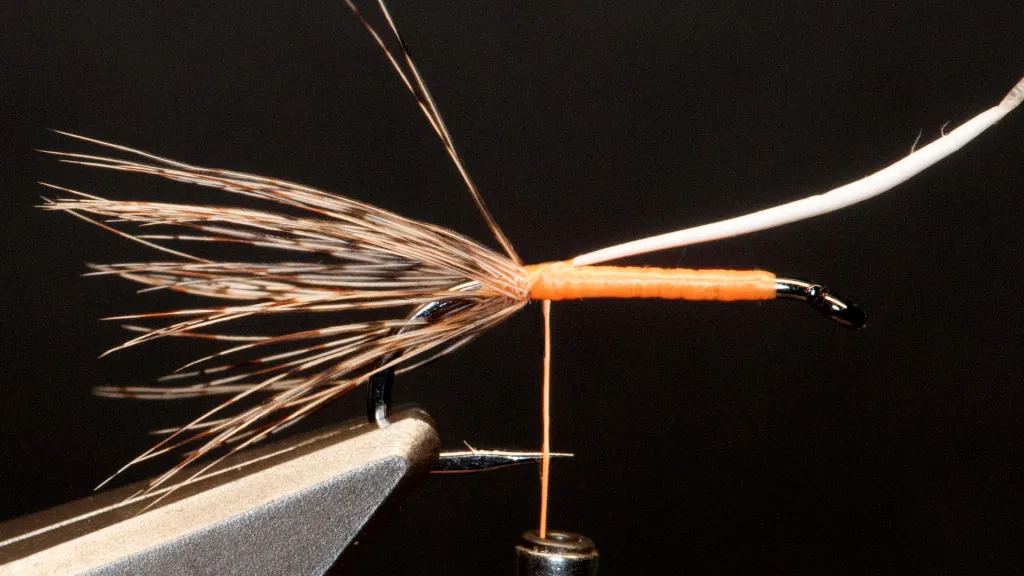 This image shows how much some materials compress, like the stem on this partridge feather. Once it's compacted, most of the wraps can be removed again without the material "inflating" and a new material can be tied on top with less bulk and more durability as a result.