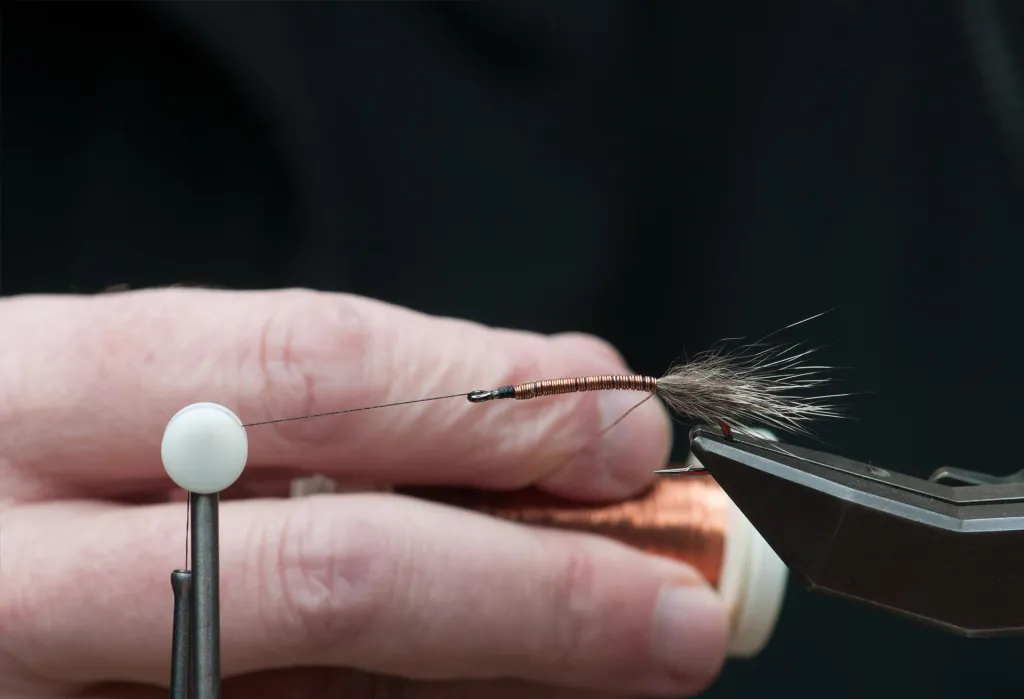 Once the copper reaches the tail, I turn and wrap it back in open turns to form a rib