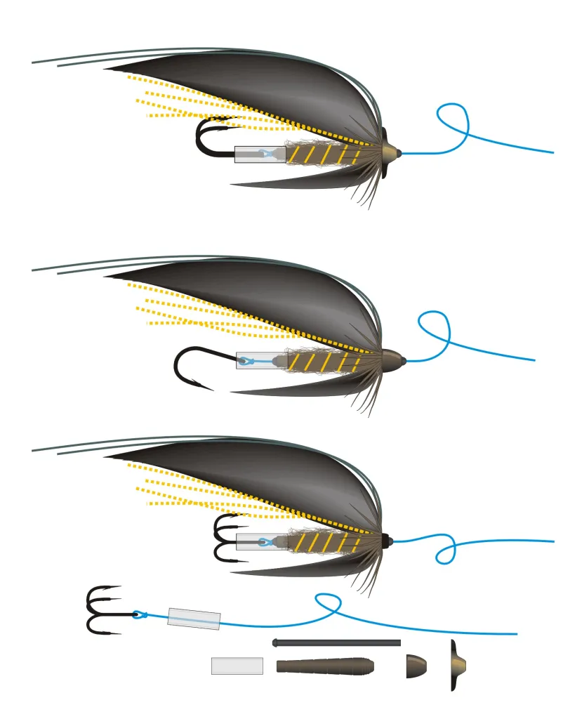 You can use different hooks on the same fly, like this one shown with a double, single and treble hook.