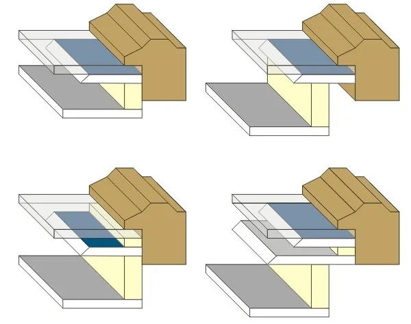 The simple frame (upper left) can be developed into various types with little effort: a deeper frame (upper right), space between glass and matte (lower left) and double matte with a second spacer (lower right).