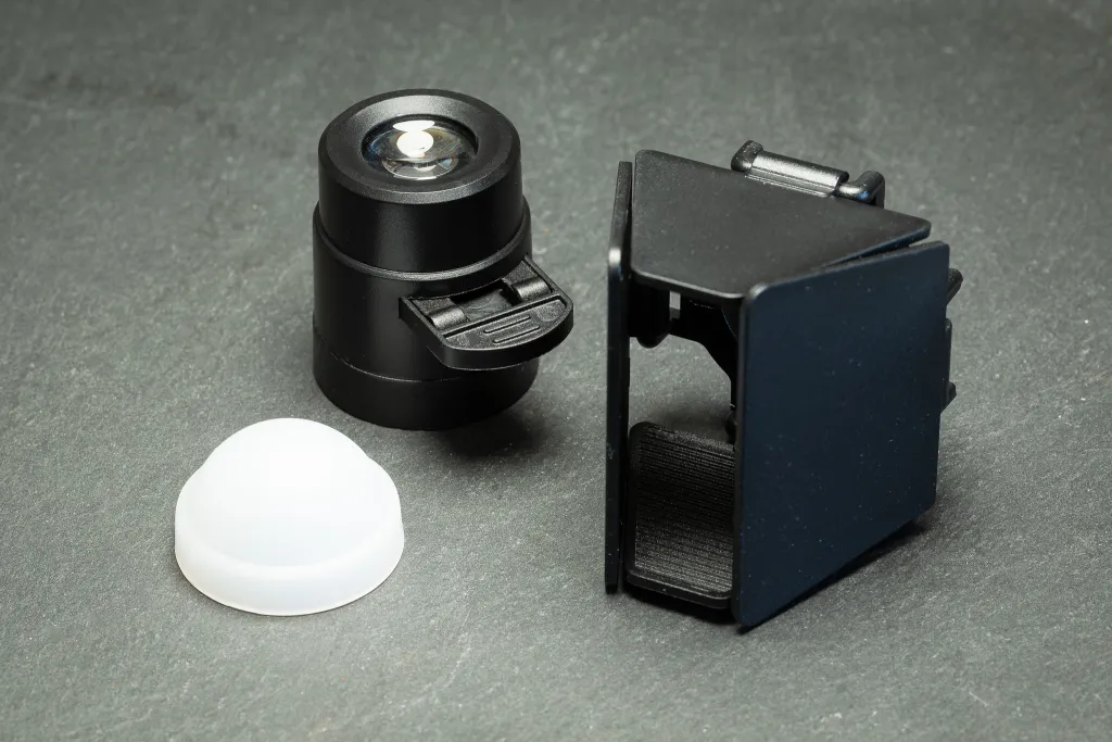 Diffusion dome, gobo lens and barn door light modifiers that fit on the end of the light.