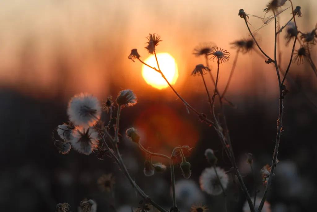 The sun is almost in the center of the image, but still plays a smaller role compared to the plants in the foreground