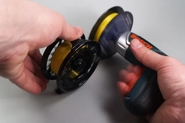 After having spooled too much backing on the reel, it is sometimes necessary to remove the surplus. An elctrical drill can ease the job.
