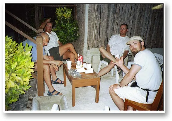 We soon adapted a local drink - a mix of the loacl coconut rum and fruit juice. The big problem was first keeping the ice from melting, then keeping it from freezing together with the extremely small freezer in the house. From left it is: Joachim, Kristian, myself (Martin) and Jan.