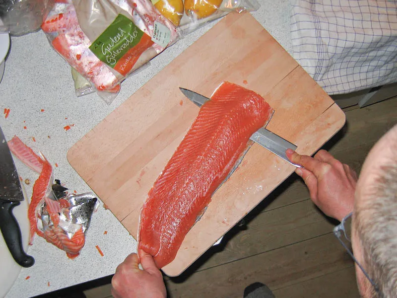 The final step before the fillet is ready for use.The skin is almost free. Notice the skin and trimmings from the other fillet next to the board. Very little meat goes to waste.