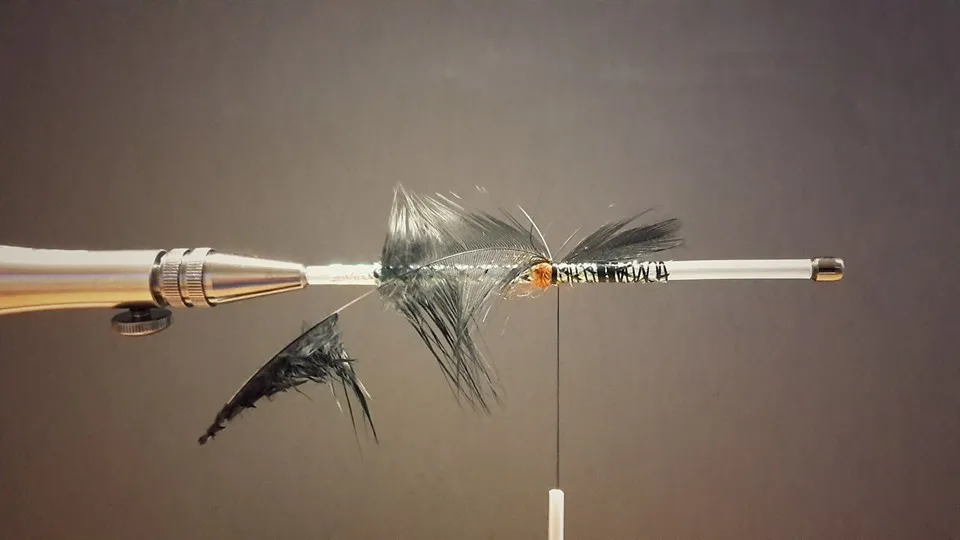 Tie in the first hackle and wrap it - tip first and curved side forward.