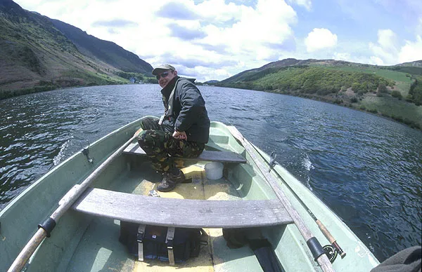 A fisheye view of Paul in the boat on Tal-y-Llyn - a most beautiful lake in Wales.