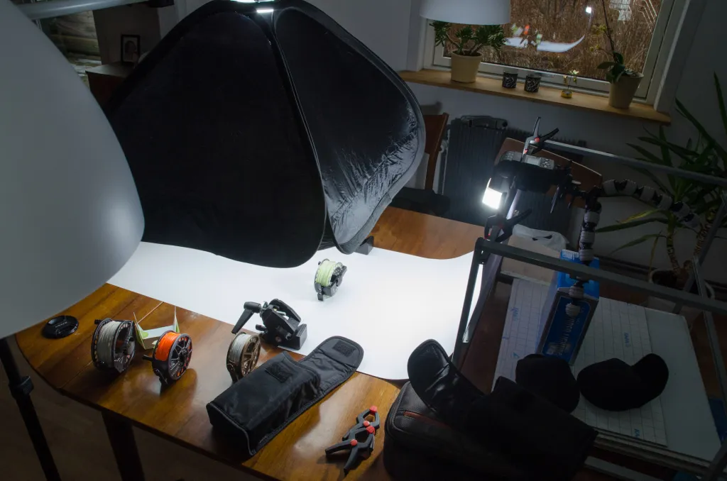 Both flashes fire when the camera does. The one in the lightbox illuminates the subject and the rear one lights up the background to create an all white backdrop for the main subject - here a fly reel