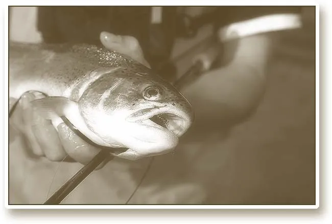 You can just exactly see the small fly in the upper jaw of this rainbow.