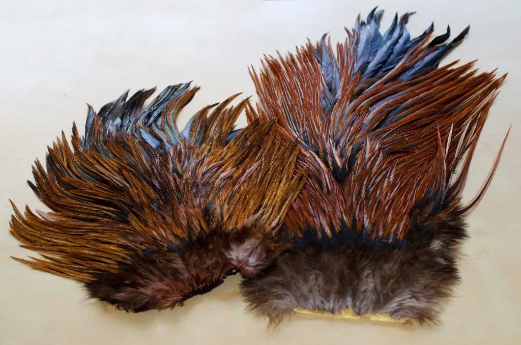 These two saddles show why you need to hand pick. They are both furnace rooster saddles in the same grade and price range, but obviously very different in size as well as color.