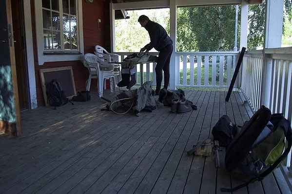Jens utilising the large poarch while getting into his waders before the first day of fishing.