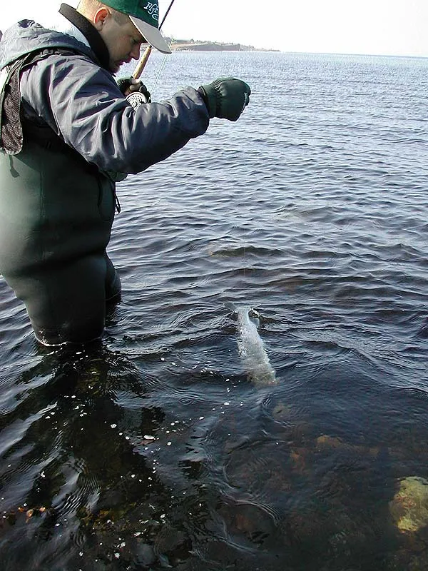 Derek grabs the leader to get control over the fish before unhooking and releasing it. This is only a good idea with smaller and tired fish. Bigger fish might break the leader with a quick splash